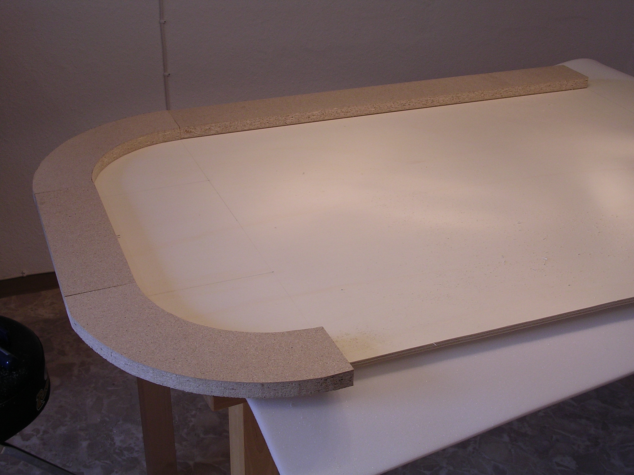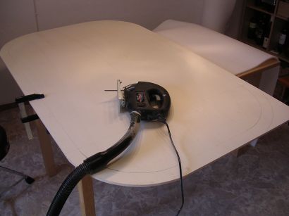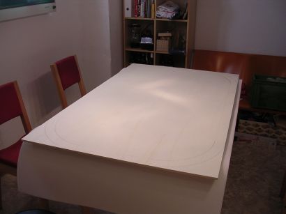 The wirst step was to place the Particle Board on the Plywood, and to draw lines where the cuts had to be made. I wished I had a proper tool for drawing the corners (200 inner and 300mm outer Radius, the rail itself is 100mm wide) but a ruler had to make do.