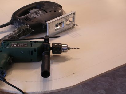 For the inner cut, I made three small drills with a 3mm drill, which is just a little wider than the jigsaw blade.